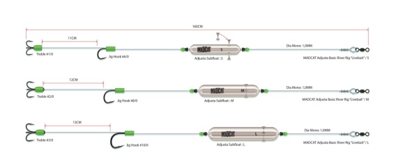 Proste, ale skuteczne przypony ze spławikiem MADCAT® Adjusta Subfloat do łowienia z dna w szybko płynącej rzece na żywą przynętę o długości 15-17 cm (np. małego karpia). Wiązane są bardzo miękką żyłką Mono Leader MADCAT® o grubości 1,00 mm.